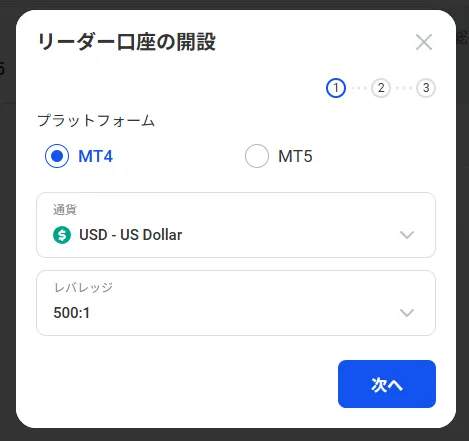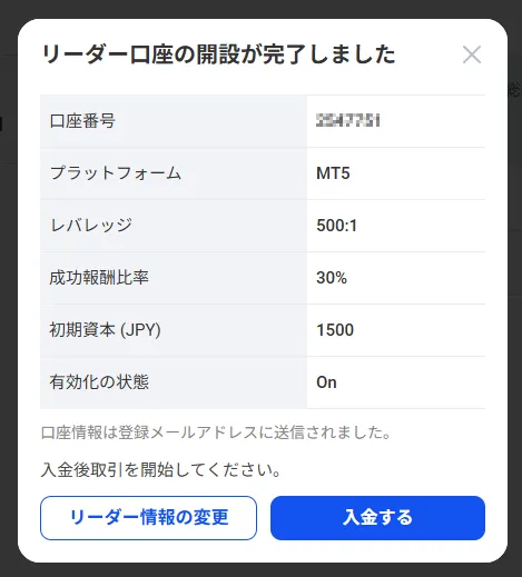 パスワードの設定まで完了したらリーダー口座の設定を行います