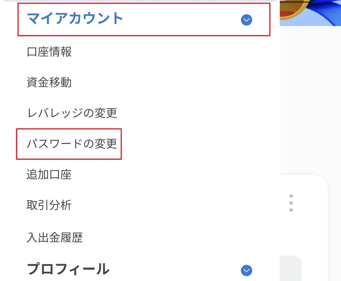マイページから、右上部の口座→マイページパスワードの変更をクリック