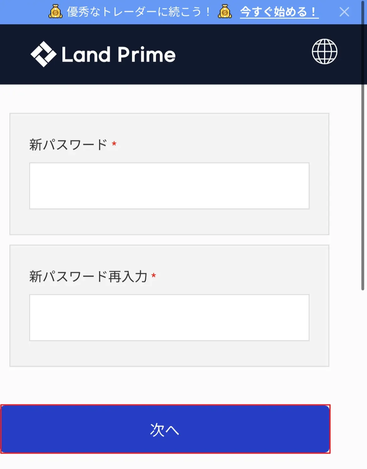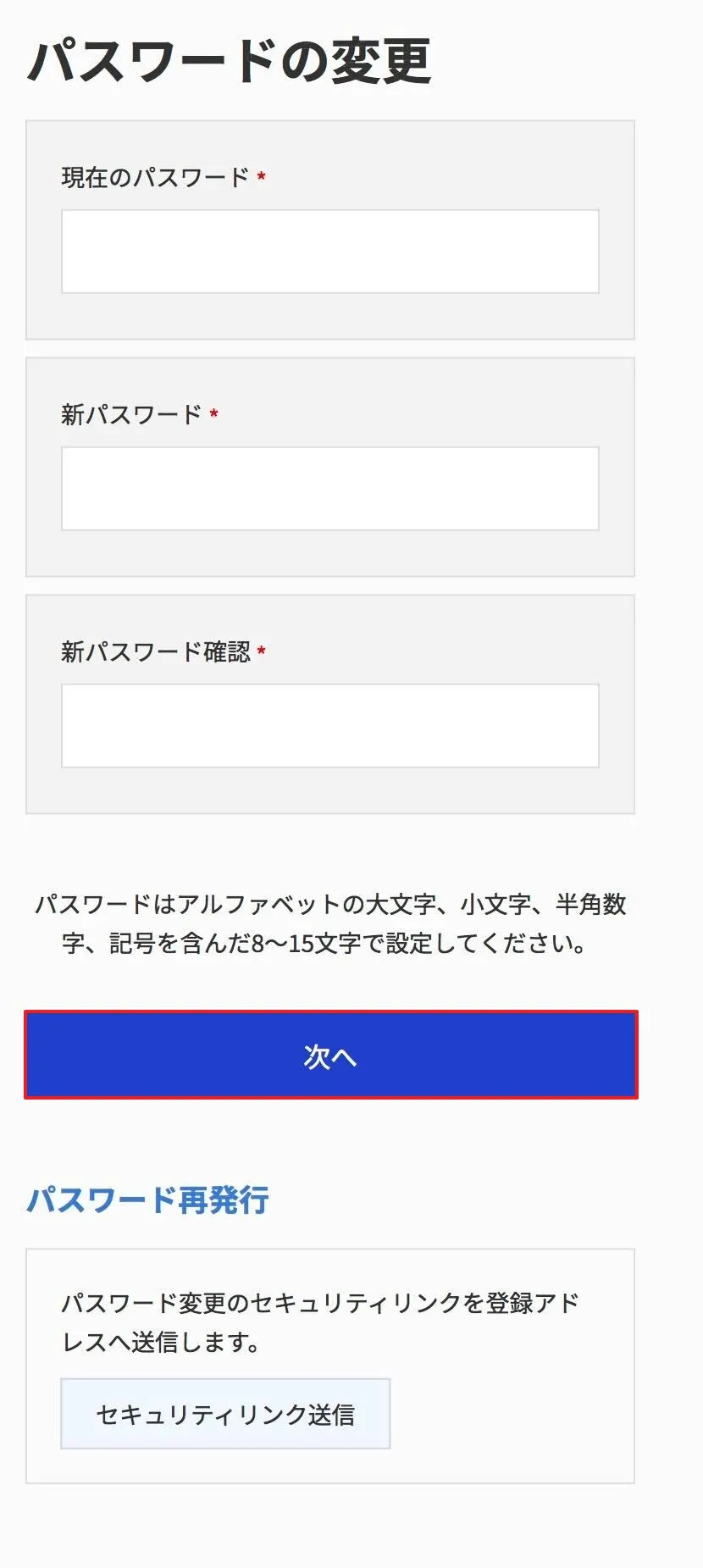 現在のパスワードを入力し、新しいパスワードを2回入力後、次へをクリック